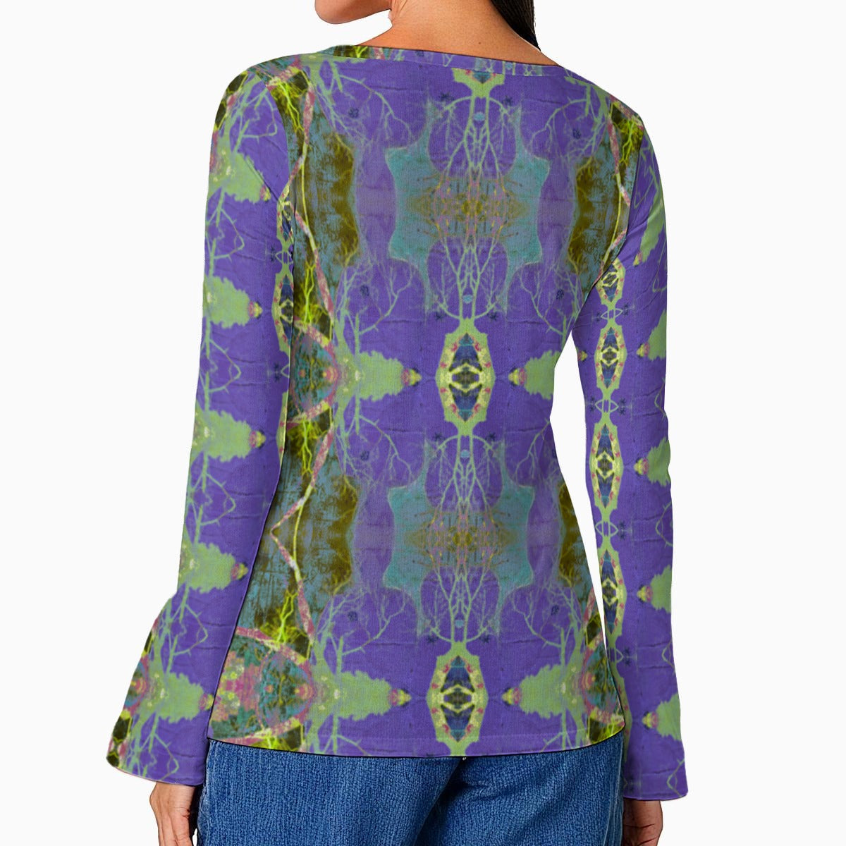 This women's long-sleeve top is made from recycled polyester, offering a soft, skin-friendly, and lightweight feel. Featuring a simple round neckline and subtle flared sleeves, it adds a touch of elegance and modern flair. The fabric drapes beautifully with a comfortable, non-restrictive fit that flatters the figure. Perfect for work, everyday wear, or casual outings, it’s an ideal choice that blends sustainability with style and comfort.