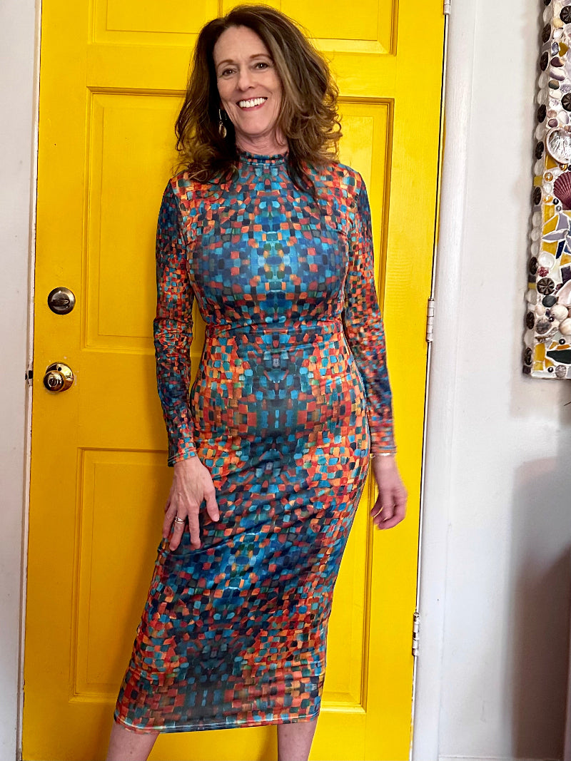 The Mock Turtleneck Dress blends comfort with contemporary sophistication. Its' smooth stretch fabric moves with you, while original artwork transforms the classic silhouette into a statement of wearable art. Sleek, versatile, and flattering, it’s the go-anywhere dress for creative souls who love polished ease and vibrant expression.