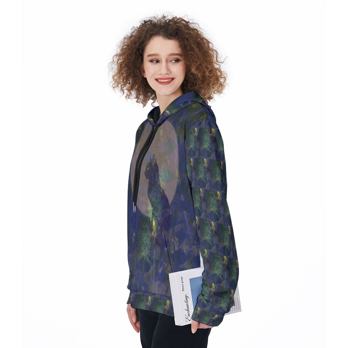 Our cozy women's fleece-lined hoodie is printed with the Taz and Blue Photomontage. "Taz and Blue” depicts a watchful cat bathed in the glow of a soft golden moon, surrounded by thistle-like blooms and layered midnight blues. The cat’s silhouette blends into a dreamlike forest of painterly textures and translucent botanicals, creating a quiet, mystical atmosphere where light, shadow, and nature merge into a single enchanted moment.
